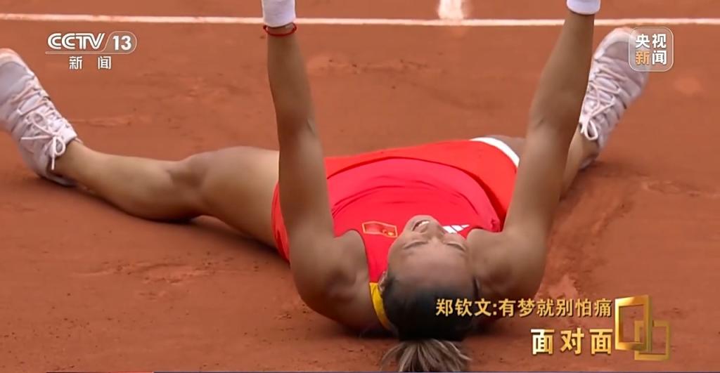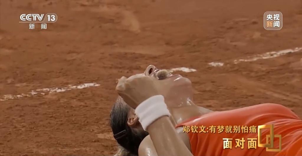 在获胜的一瞬间,郑钦文扔掉球拍,躺在了罗兰·加洛斯球场的红土上。再度起身,她一边向观众致意,一边用手擦拭着眼泪,走向她那来之不易的胜利。