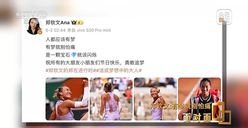 2025年6月,郑钦文WTA世界排名升至第四,创下个人新高。但本赛季因伤连续退赛,或将影响她的世界排名。此前她曾回应,如果有实力打败所有人,排名无所谓。在个人社交媒体上,郑钦文又一次引用歌词:“人都应该有梦,有梦就别怕痛”,表达追梦的决心。