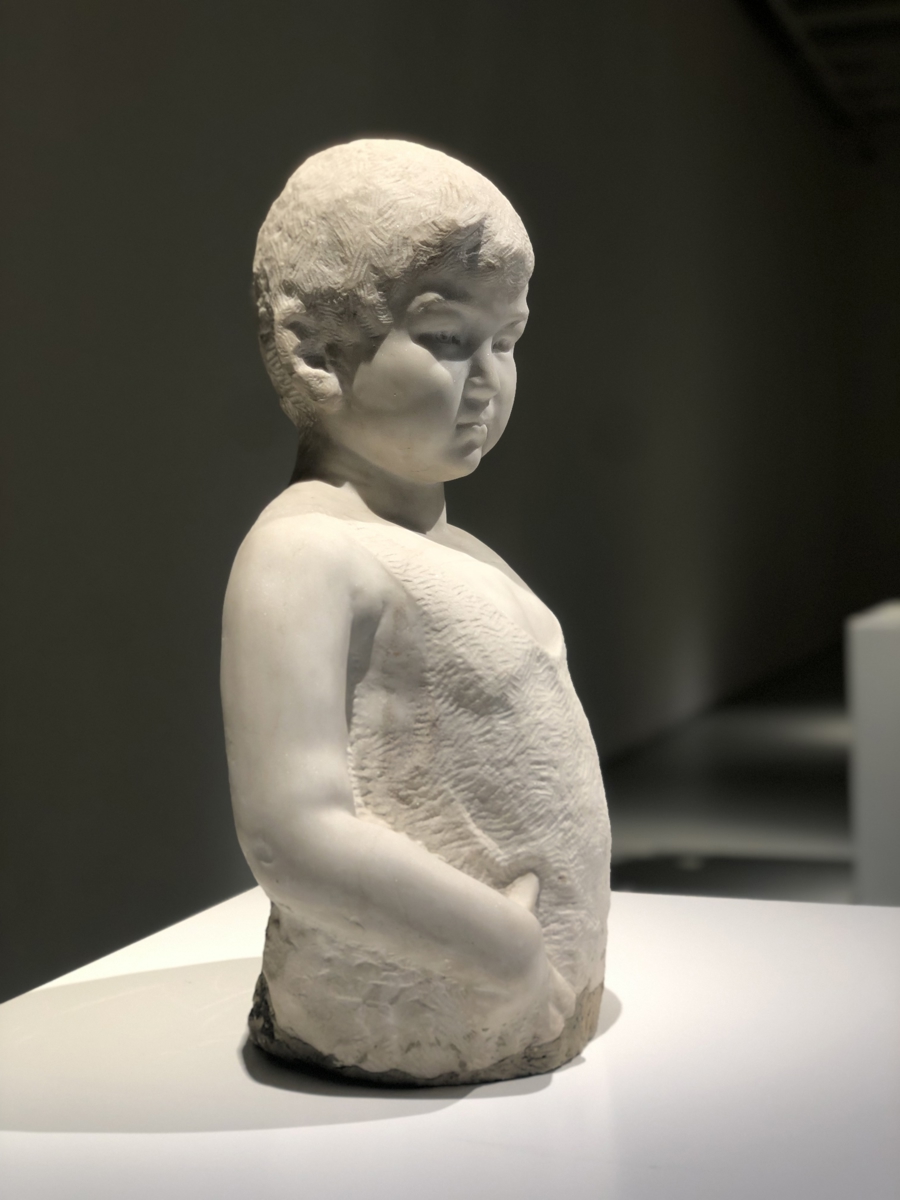 一批来自老一代艺术家的特邀作品充分显示上海雕塑的底蕴。聚焦儿童形象的《这一代》,温润典雅,是唐锐鹤的作品,用大理石进行雕琢,做的是减法,从人物眼神、姿态到穿着的小背心,无不见出老一代艺术家精到的雕琢技艺,只见其肌肤的处理是光滑的,背心、头发的处理则是毛躁的。唐世储的《小憩,爱因斯坦》,用的是铜塑的方式,人物的眼神、手里拿着的烟斗,甚至毛衣背心里边衬衣的领子,均表现得恰如其分,让人从中感受到爱因斯坦的神采。