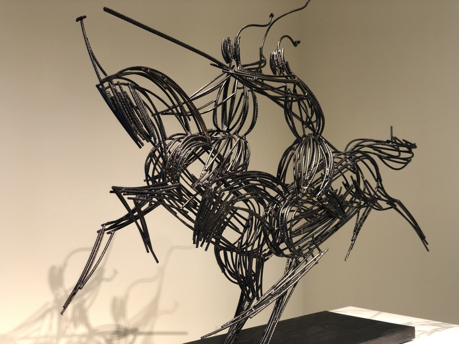 材料、工艺的多样化,就是其中之一。“除了以往常规的泥塑,还出现了木制、各种金属、陶瓷等越来越丰富的雕塑材料。”陈屹说。例如,乍一看有些像仙人掌的李星醒《占卜》,就是一件综合了玻璃钢和木头材质而创作的。李昊泽表现草原牧民骑马进行套圈比试的《风从草原来》,将钢筋变化成一根根类似素描的线条,一反雕塑表达的固有方式。梁国兴的《拂晓》,力图用金属材质表现出一种类似编织的视觉效果。郭海鹏的《沪上工程》以闪闪发光的电镀材料再现工地场景,呈现出赛博朋克般的当代观感。