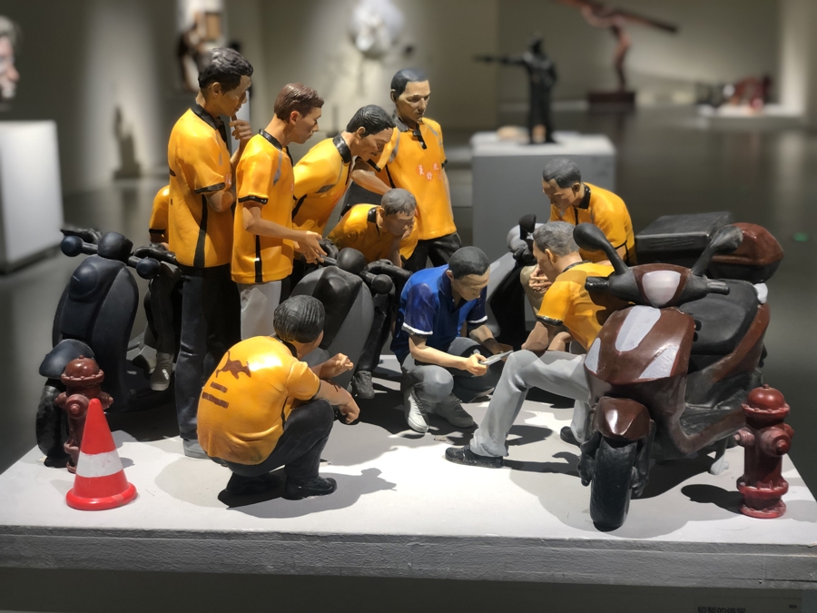 陈屹也特别提到,很多作品体现出艺术家认真的创作态度,不仅在于扎实的基本功,也在于对于现实生活的观照。例如,周祺的《短暂的停留》定格的是颇为生活化的一幕场景,只见一群快递小哥忙中偷闲,围着其中一位手里拿着的手机,津津有味地看着足球赛。乐乐《watcher》是一件超写实的猩猩雕塑,精准地捕捉到动物的造型以及内在表达。