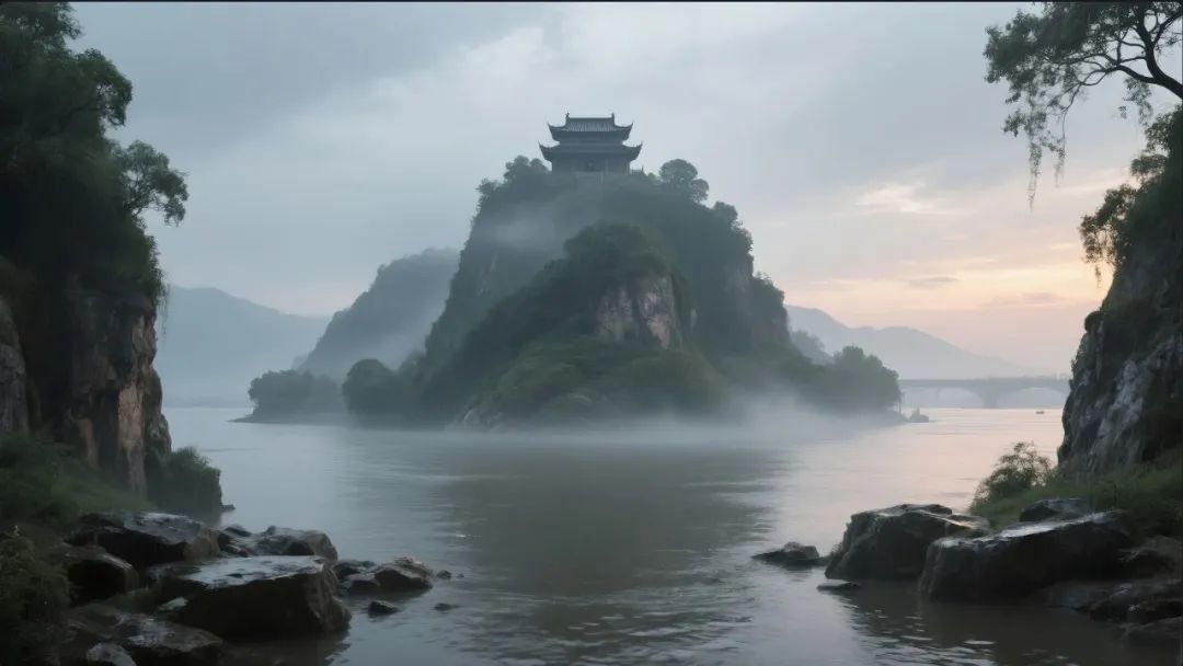 一只火焰般的美丽凤凰在夜空中飞舞,发光的彩色羽毛划出闪亮的弧线,时间仿佛停止,山水与之共鸣。它飞了一会儿,停在了凤凰池边。