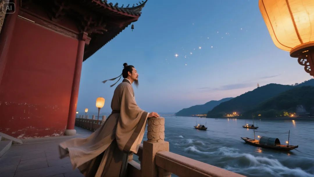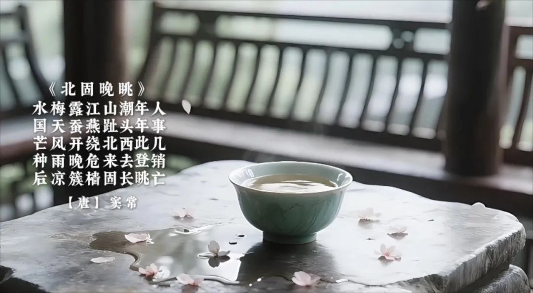 已是傍晚时分,只见唐朝诗人窦常正眺望远方,吟诵着《北固晚眺》。